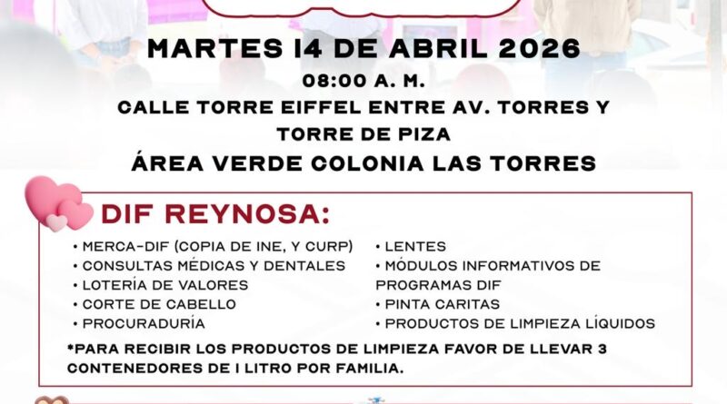 Por instrucciones del Alcalde, Carlos Peña Ortiz, el Sistema DIF-Reynosa que preside Carlos Luis Peña Garza, llevará a la colonia Las Torres la brigada “DIF en tu Colonia”, este próximo martes 14 de abril, acercando diversos servicios gratuitos para beneficio de la comunidad.