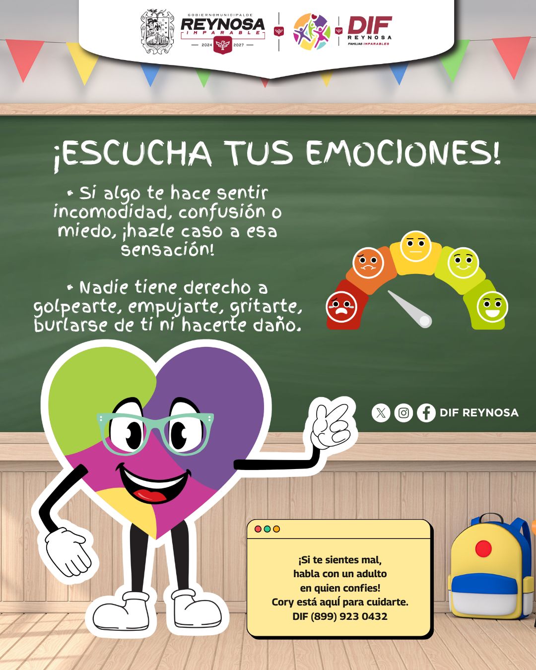 El Sistema DIF-Reynosa que preside Carlos Luis Peña Garza, impulsa la campaña de prevención y cuidado de la niñez a través de «Cory», que hace un llamado a niñas y niños a reconocer la importancia de sus emociones y a expresarlas, como parte fundamental de su bienestar y desarrollo integral.