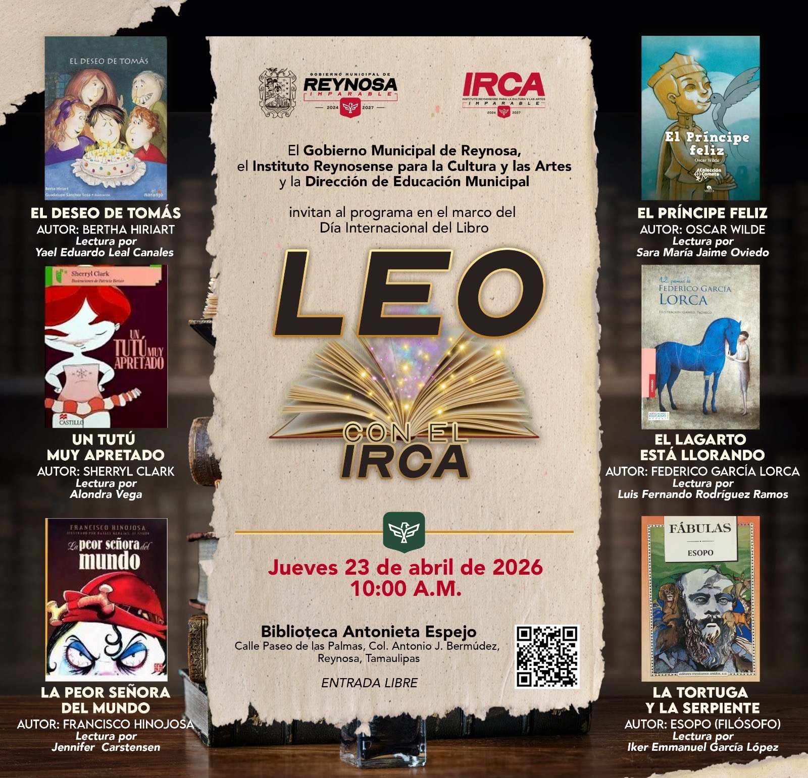 El Gobierno de Reynosa, que preside el Alcalde Carlos Peña Ortiz, invita a disfrutar de una mañana dedicada a las grandes historias con «LEO con el IRCA», en el marco de la celebración del Día Internacional del Libro.